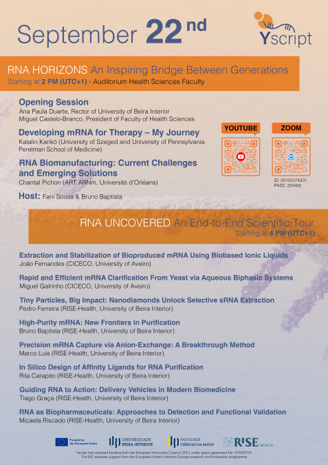Yscript project partner University of Beira Interior (UBI) will host a hybrid workshop titled “RNA Horizons: An Inspiring Bridge Between Generations”, showcasing the RNA biomanufacturing process.