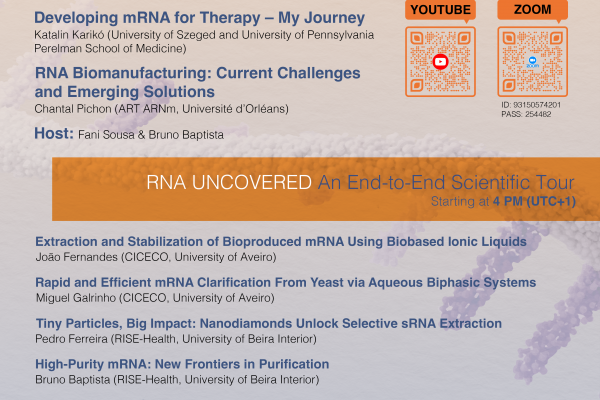 Following the plenary sessions, on-site participants will be invited to explore the interactive circuit “RNA Uncovered: An End-to-End Scientific Tour”, composed of several thematic stations presenting each step in the RNA biomanufacturing process – from production and purification, through stability assessment, to formulation, delivery, and detection. With the application of RNA-based therapeutics steadily expanding, this workshop aims to foster dialogue and share knowledge in a rapidly evolving field.